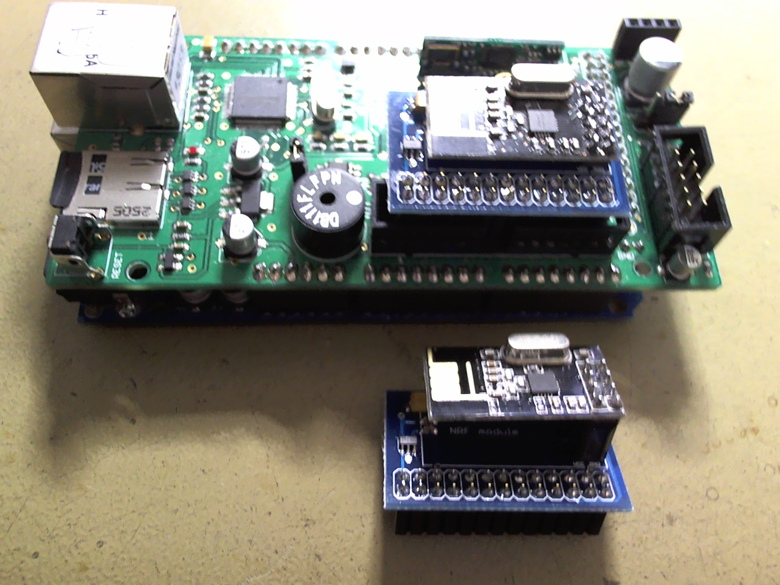 Als je ook al een breadboard gebruikt moet je rekening ermee moeten houden dat je niet de poorten gebruikt die je voor de NRF nodig hebt. Als die beschikbaar zijn kan het gewoon naast elkaar werken. We zijn nog aan het kijken naar extra lange pinnen voor de NRF koppel print zodat een breadboard connector er zo bij op kan. Maar die zijn behoorlijk prijzig en is even de vraag of we die standaard mee gaan leveren.... Of daar een aparte kit van maken, of we maken een andere print voor die gevallen.. Maar je kan in ieder geval altijd een rij pinnen bovenop de pinnen van de NRF koppel print solderen.