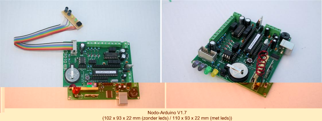 - opzetprint voor de Mega; op deze print zit een geintergreerde ethernetaansluiting en alle componenten die nodig zijn voor de Nodo (IR ontvanger, IR zender, RGB led, luidsprekertje, 433 Mhz zender, 433 Mhz ontvanger, 8 beveiligde analoge poorten, 7 beveiligde digitale poorten, RTC klok), resetknop en SD kaarthouder. Eigenlijk is het een Arduino ethernetshield + Nodoshield + extetionshield ineen.