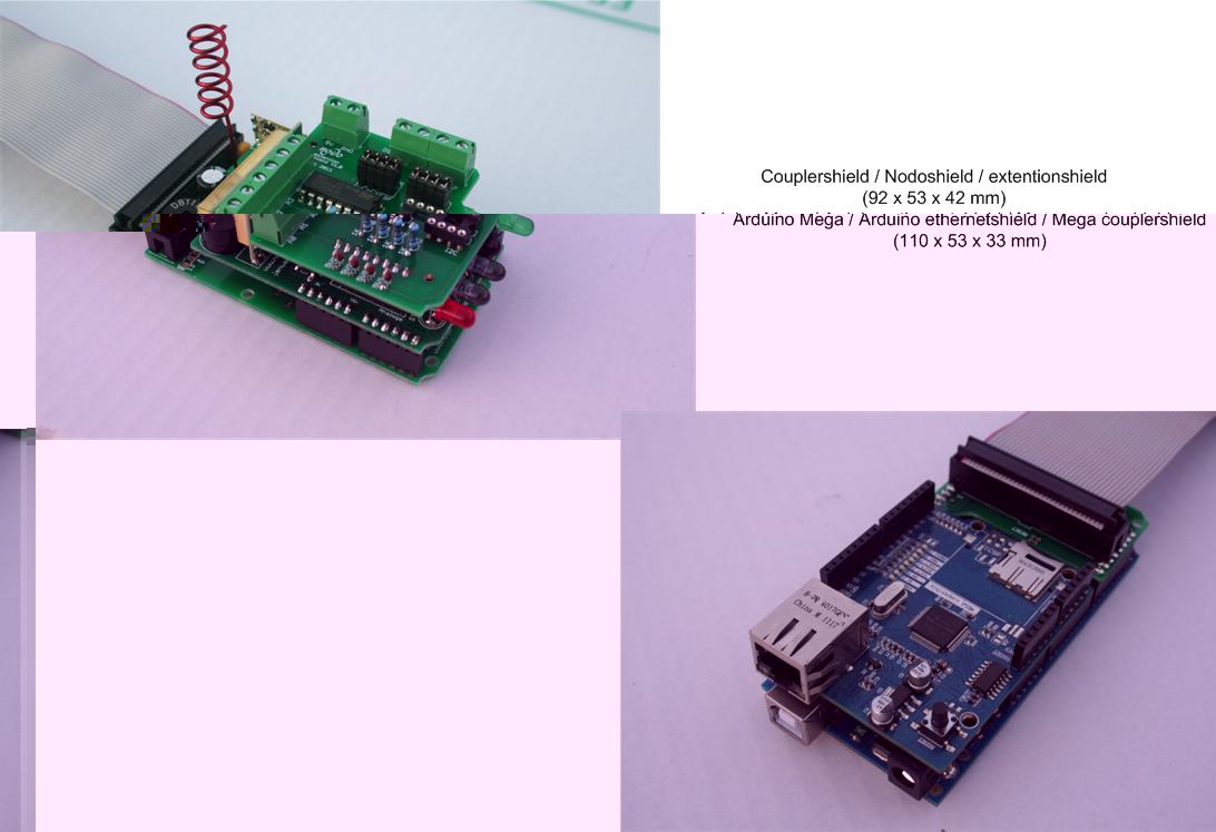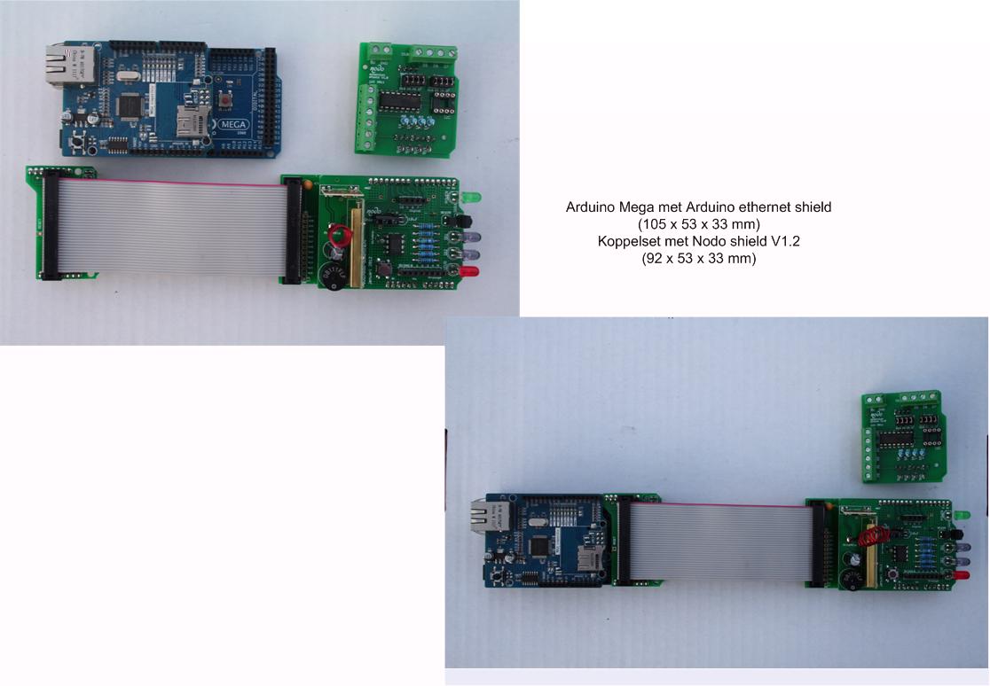 De ethernetshield kan gewoon op de Mega worden geplaatst en achter dit shield (op de vrije aansluitingen) wordt de Mega-connectionprint geplaatst, vanuit deze print gaat een bandkabel naar een 2e print waarop de Nodoshield kan worden geplaatst.Op deze print zijn ook nog extra aansluitingen voor 5V/GND en niet gebruikte poorten.
